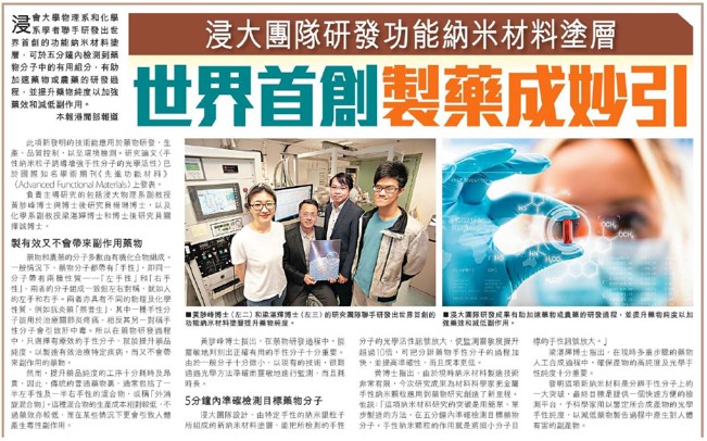 Physics and Chemistry scholars from Hong Kong Baptist University (HKBU) have invented a new method which could speed up the drug discovery process and lead to the production of higher quality medicinal drugs which are purer and have no side effects. The technique, which is a world-first breakthrough, uses a specific nanomaterial layer to detect the target molecules in pharmaceuticals and pesticides in just five minutes.