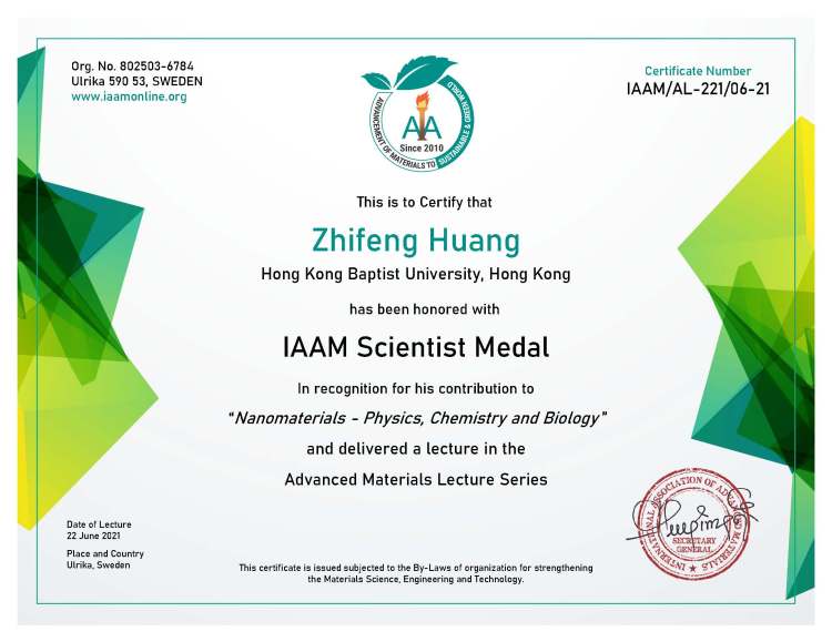Dr. Huang was honored with IAAM (International Association of Advanced Materials ) Scientist Medal.