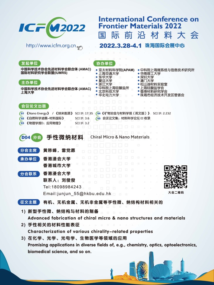 Dr. Huang, with Dr. Dangyuan Lei at CityU, chaired Session D04 (Chiral Micro & Nano Materials) at International Conference on Frontier Materials 2022.